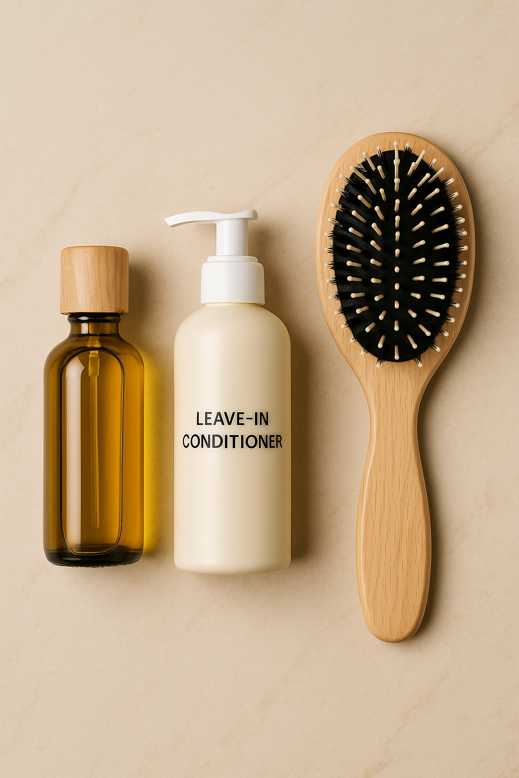 • Mist a light, silicone-free leave-in from ears down. (For tape-ins: avoid the first 2–3 inches at the roots.)